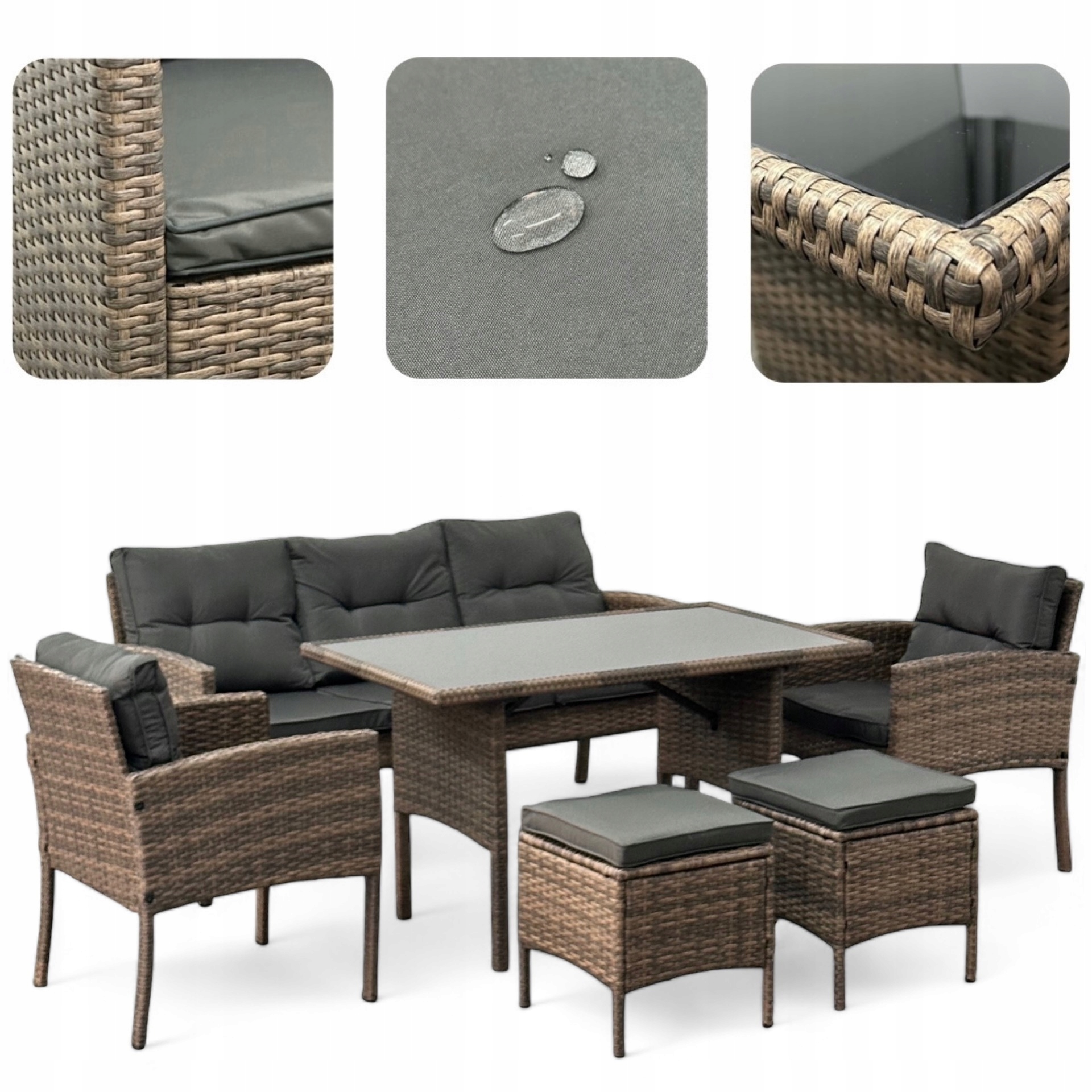 Ile miejsca potrzeba na całość? Aby swobodnie korzystać z sofy, dużego stołu oraz wszystkich foteli i puf, optymalna przestrzeń to około 3,5 x 2,5 metra. Dzięki temu, że zestaw nie posiada sztywnego narożnika, możesz dowolnie „otwierać” lub „zamykać” strefę wypoczynku, dostosowując ją do kształtu swojego tarasu lub balkonu.